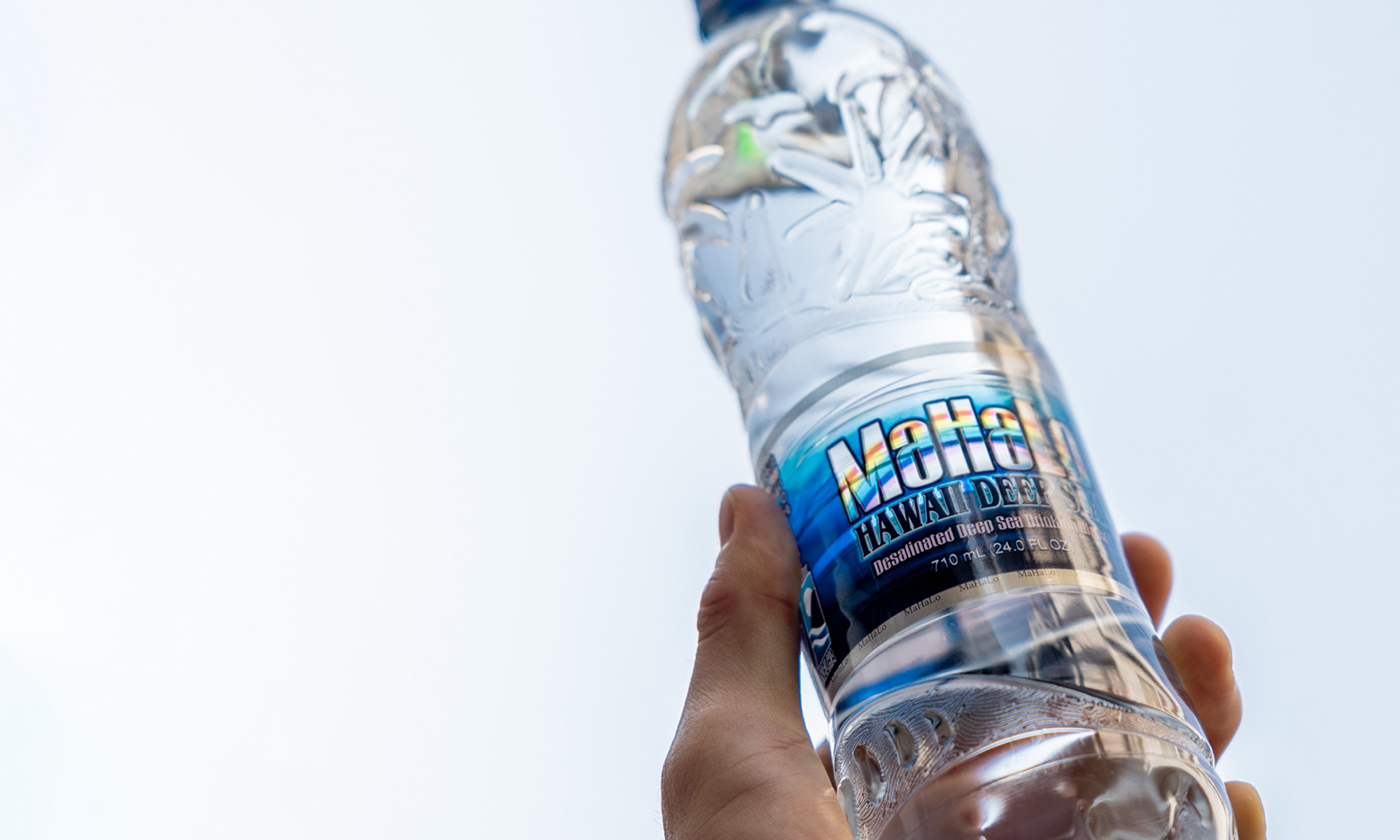 「超☆海洋深層水100%マハロ」はよりクリアなイメージ、そしてリサイクルのしやすさを考慮し、PETボトルを、従来の青から無色透明に変更いたします。 持続可能な世界のために、水も、ボトルもやさしく。